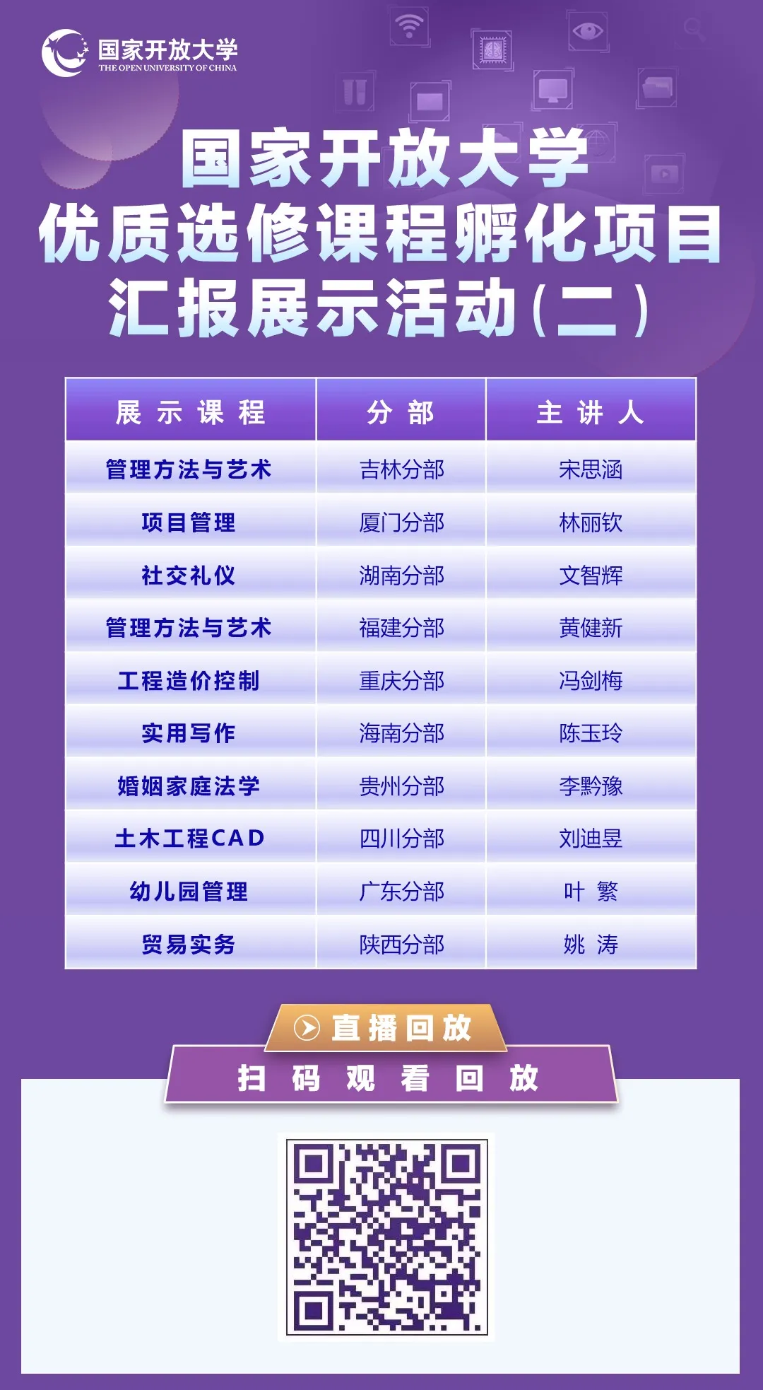 目前,国家开放大学已分两批立项建设33家分部的54门优质选修课程,后续将通过线上线下成果推广,推动优质课程资源落地见效,赋能开放教育人才培养高质量发展。