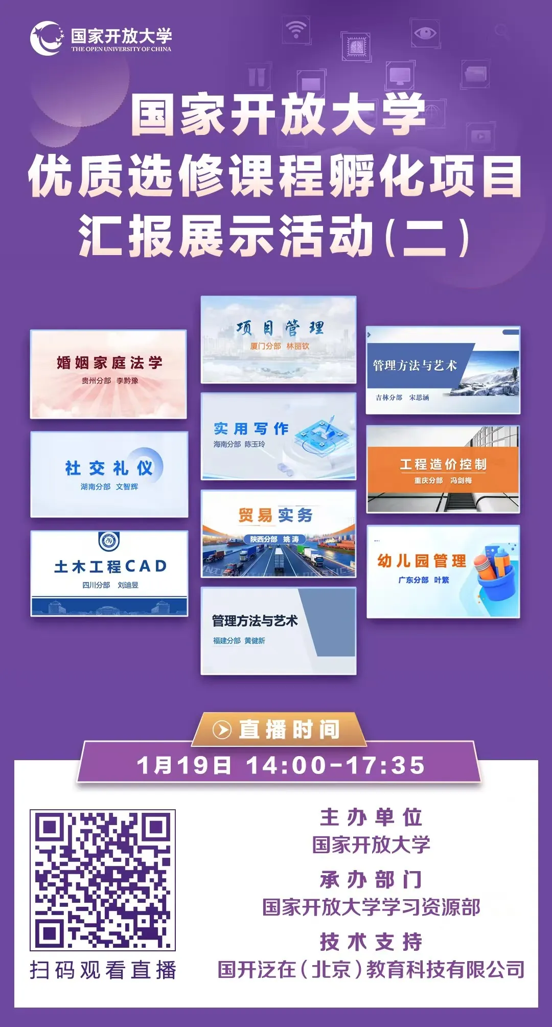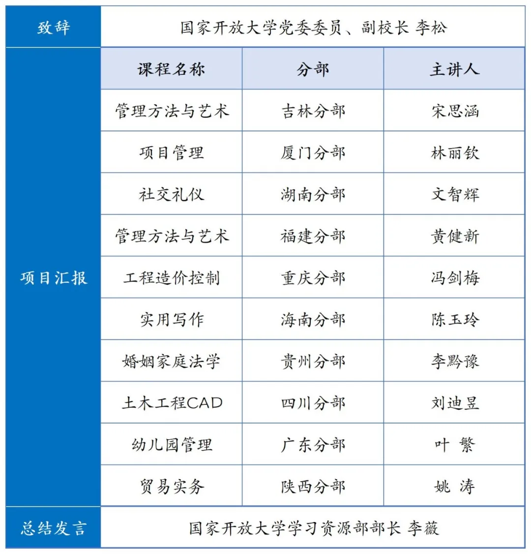 为深入贯彻《数智赋能一体化协同推进开放大学教育教学综合改革实施意见》,推进实施开放教育“101计划”,进一步提升省开课资源建设水平,推动优质资源共享应用,国家开放大学将于1月19日举办优质选修课程孵化项目第二期汇报展示活动,来自10个分部的课程主讲教师将围绕课程资源建设与特色亮点进行分享。