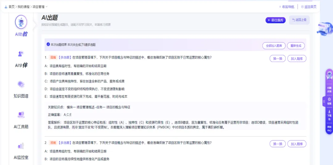 课程构建了“知识图谱+AI助学”的个性化学习生态。知识图谱以结构化形式串联核心知识点,帮助学生快速搭建系统知识框架;AI助学助教系统提供个性化答疑、学习进度智能适配、重点知识强化推送等功能,解决成人学习者“时间零散、基础不均”等问题。通过数智赋能,实现“碎片化输入、系统化输出”,学习者学习效率与知识掌握度显著提升。