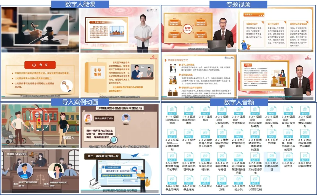 音视频资源:建设51讲数字人微课(402分钟),采用“案例导入-知识讲解-迁移思考”结构,强化理实结合;邀请实务专家录制4讲专题视频(180分钟),深入解读《最高人民法院关于民事诉讼证据的若干规定》,提升实务深度;建设音频资源34条(95分钟),覆盖非核心知识点,适配碎片化“听学”需求;制作9个导入案例动画(20分钟),重在创设案例情境、激发学习兴趣。