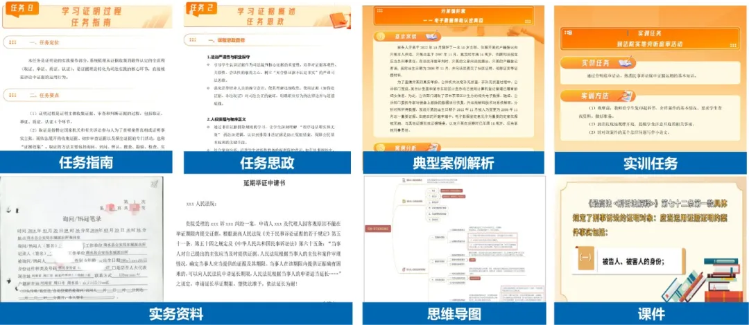 双实:一是案例真实,课程融入178个源于法院生效判决或高仿真实务场景的教学案例,使学生直面法律实践复杂原貌。二是操作实用,建设实训资料库,设置延伸任务,直指证据收集、举证目录编制、证据交换等核心职业技能。