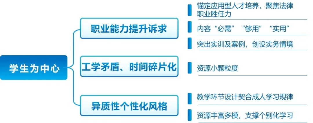 一是以“人”为本,精准适配学习者特征。学习者主要为开放教育法学本科学生,其学习目标明确指向法律职业能力提升,但工学矛盾突出,学习时间碎片化,学习偏好多元。依据成人学习者具有自我导向、经验丰富、内在驱动等特征,课程建设聚焦职业能力,对知识点进行“小颗粒度”切分,适配移动学习和碎片化场景,同时建设内容丰富、形式多样的资源体系,满足个性化学习需求。
