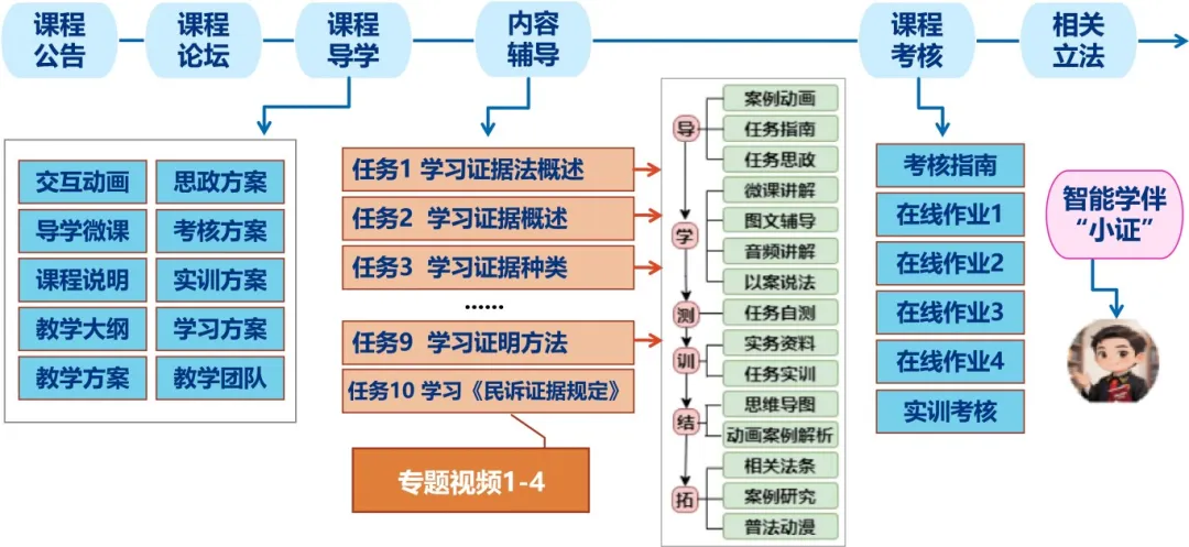 团队将数字化资源一体化设计整合为网络课程,课程前9个任务严格遵循“导-学-测-训-结-拓”六环节,契合学习者“感知-理解-巩固-应用-拓展”的认知规律;第10个任务为基于司法实务需求的延伸学习,补充《民事诉讼证据规定》解读等实务必备内容。课程还引入智能学伴“小证”,提供实时答疑、学习指引等功能,让学习更具针对性和高效性。