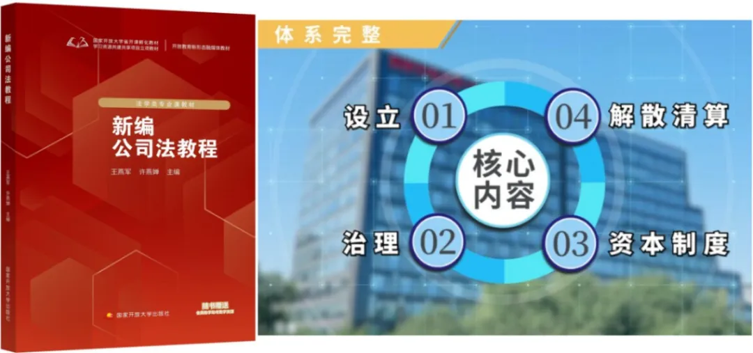 课程团队编写的开放教育新形态融媒体教材《新编公司法教程》以公司全生命周期为主线,设置四大模块、十一个单元:以基础理论搭建认知框架;主体制度整合有限与股份两类公司形态;运行保障涵盖治理责任、财会规范及变更终止;法律责任形成闭环约束,构建完整知识体系。
