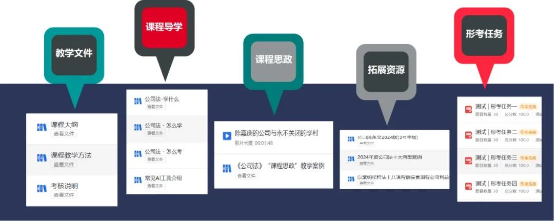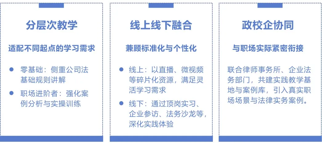 课程在教学模式和内容设计上突破传统框架,让理论学习与职场实践紧密衔接。内容上,打破“法条解读+理论分析”传统模式,以公司“设立-运营-变更-终止”全生命周期为线索,将法条嵌入真实职场场景,实现即学即用。