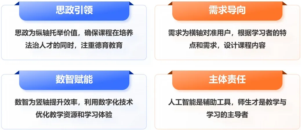 课程建设以“思政引领-需求导向-数智赋能-主体责任”为核心驱动,以习近平法治思想为指导,将法治精神、职业伦理、社会责任融入课程各环节,融合法治与德育教育;紧扣成人学习者职场实操与灵活学习需求,建设实用化课程内容与弹性学习路径;运用数字人、AI助教等技术破解资源建设痛点,实现资源动态更新与跨校跨区域复用;明确人工智能辅助定位,突出师生教学主导地位,防范技术依赖导致的思维惰化。