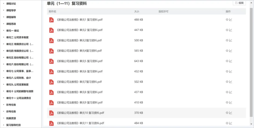网络课程建成9大栏目,全链条支持实现“随时学、学得懂、用得上”:通过导学明确学习路径,辅导栏目拆解核心难点,11个单元按知识体系拆分学习任务;配套的案例库、习题库,支持学习者在线练测;思政专区融法治与伦理,讨论区促师生互动;形考侧重过程评价,终考结合理论与实务;复习指导助力备考。