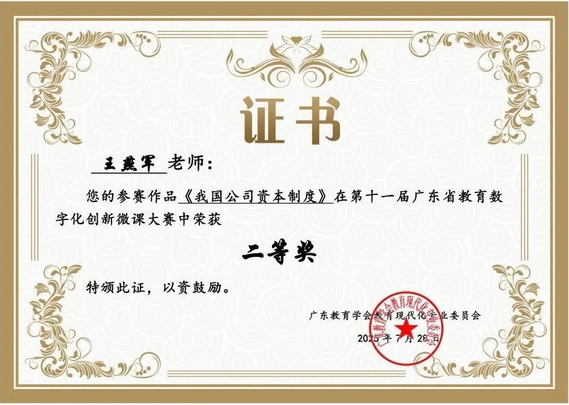 课程团队整理“公司法”课程思政教学案例,为申报课题和案例比赛做准备。《我国公司资本制度》微视频在第十一届广东省创新微课大赛中荣获二等奖,取得积极成效。