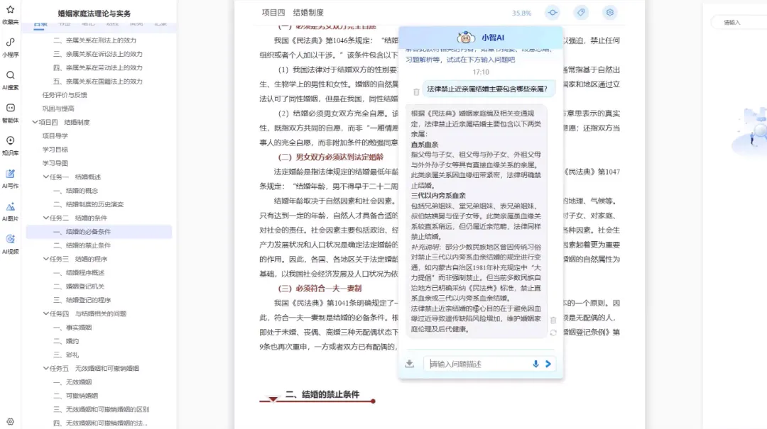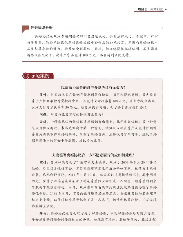 基础文本层(结构化知识锚点):新版纸数融合教材《婚姻家庭法理论与实务》围绕婚姻家庭法律关系的全生命周期,设计八个学习项目。教材采用“项目-任务”式编写体例,构建“项目导学→学习目标→学习导图→任务学习→示范案例→任务评价与反馈→巩固与提高”的全流程学习闭环。每个项目始于真实“任务情境”,引导学生以法律工作者视角主动思考,在分析与解决具体问题的过程中,自主探寻并建构所需的法律知识体系,最后通过“任务评价”进行反思与巩固。这种设计将系统知识拆解为与工作、生活场景直接关联的模块,适应成人碎片化学习习惯,实现“即学即用”。