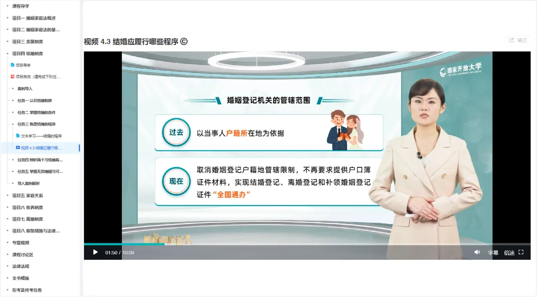 为贯彻落实《数智赋能一体化协同推进开放大学教育教学综合改革实施意见》,推动省开课资源高质量发展,国家开放大学分批立项孵化建设33家分部、54门优质选修课程。目前,第一批21门课程已完成建设并通过验收。本期推出贵州分部“婚姻家庭法学”课程建设成果。