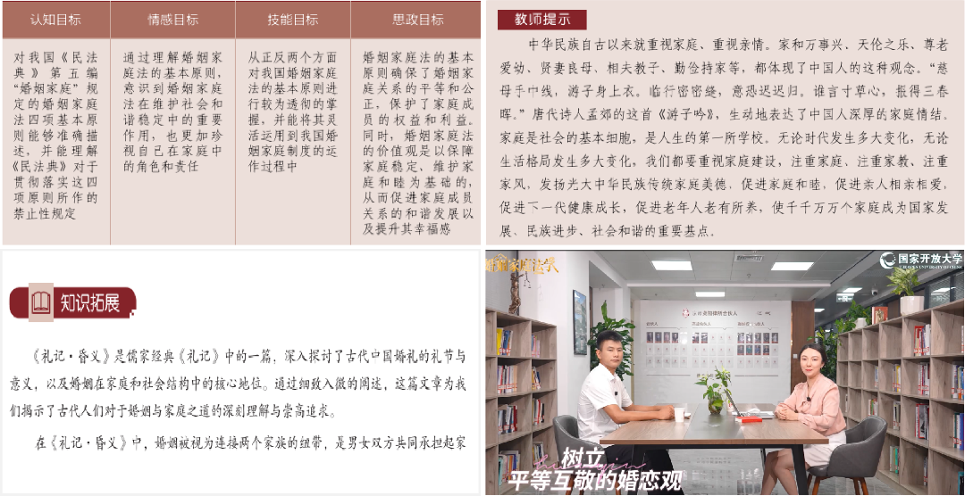 “婚姻家庭法学”作为国家开放大学法学专业的一门选修课程,精准对接开放教育应用型人才培养定位,直面成人学习者“知识更新迫切、实务需求强烈、学习时间碎片化”的核心特征,以破解传统教学“知识滞后、学用脱节、资源单一”痛点为突破口,构建起“知行合一、德法相融”的课程新生态。
