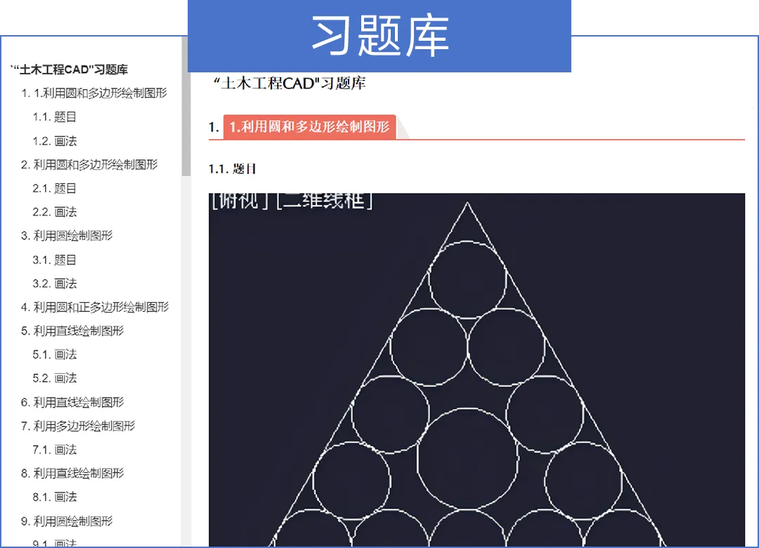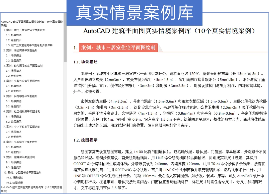 搭建实战化练学资源库:构建真实情景案例库,覆盖建筑平面图、立面图、详图、剖面图等类型,每个案例均配有场景描述、绘图提示与步骤详解,让学习者在解决真实问题中完成能力进阶。同步配套专项习题库,关键习题提供画法演示视频,实现“以练促学、以练固能”。