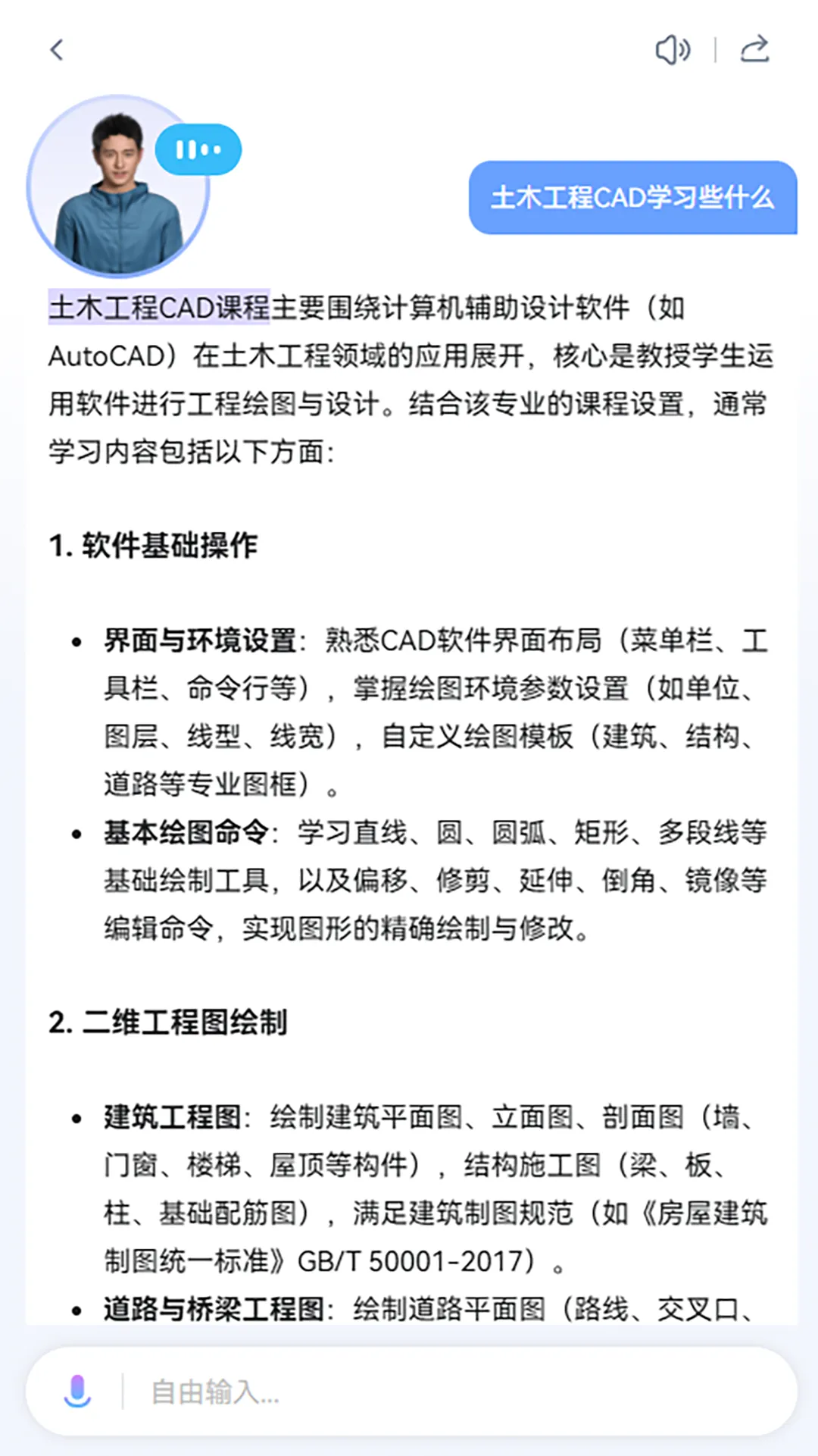 引入智能化教学辅助工具:智能学伴为学习者提供个性化学习建议,实时答疑解惑,实现“一对一”全程伴学;建筑施工仿真平台将“工地”搬进课堂,涵盖全流程施工模块,学习者可在高安全、低成本环境中完成工程实操训练,实现从CAD软件操作到工程实际应用的无缝衔接。