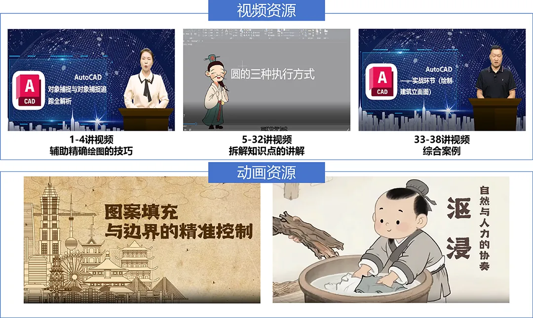 打造多形态视听资源:实操视频聚焦软件操作、工程绘图等核心技能,支持学习者按需自主学习;动画资源可视化呈现“图案填充”“边界控制”等抽象知识,生动呈现千年纸韵等思政文化内涵,降低认知门槛。