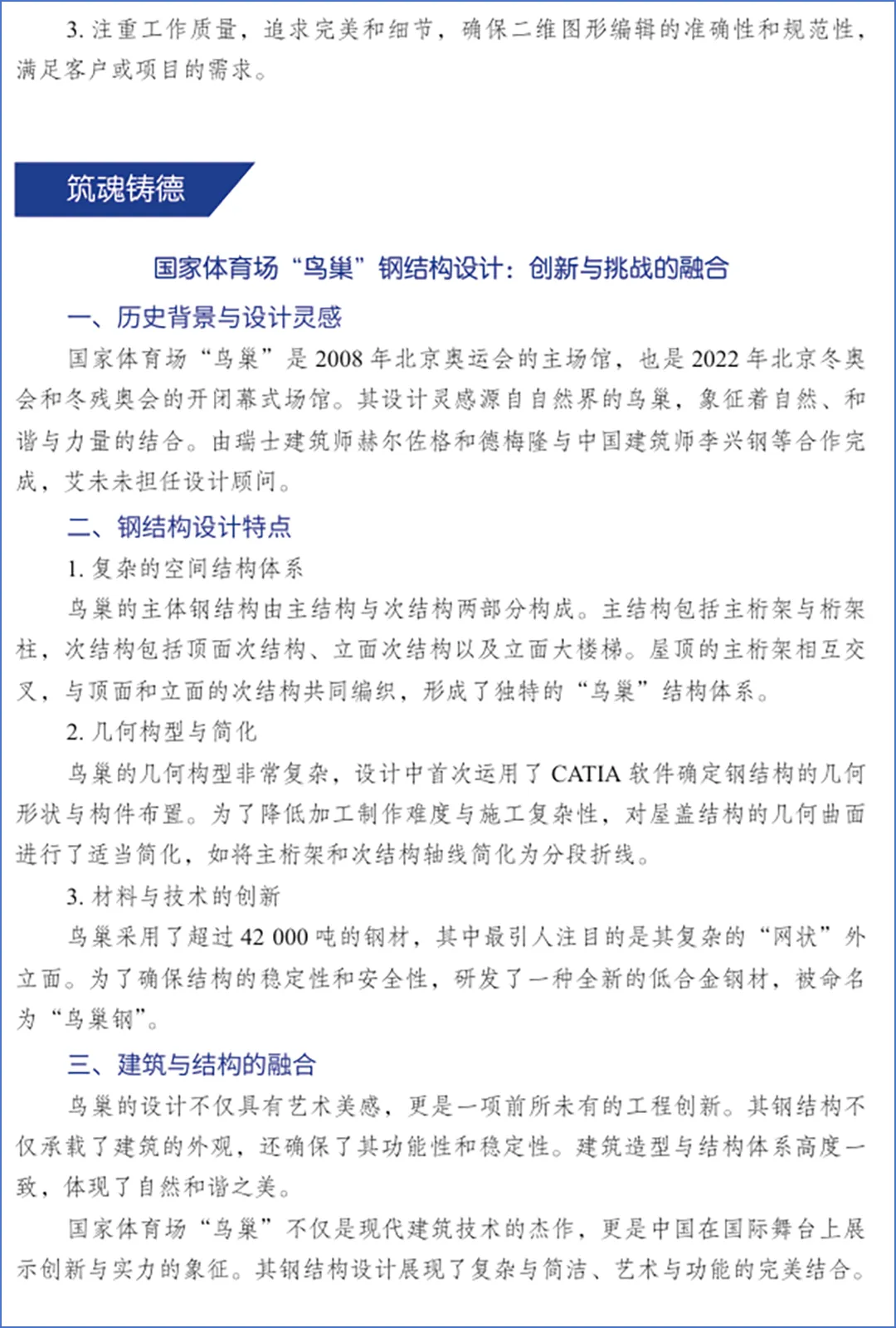 课程秉持“立德树人”根本任务,构建“模块赋能+全程渗透”思政育人体系。在教材与网络课程中专设“铸魂筑德”模块,融入中华优秀传统建筑文化,弘扬行业榜样的工匠精神与职业追求。结合中国高铁、智能建造等国家重大工程发展成就,厚植学习者的民族自豪感,激发行业使命感。依托图纸绘制实操训练,强化规范意识与严谨态度,让学习者在实操历练中养成求真务实、精益求精的职业操守。